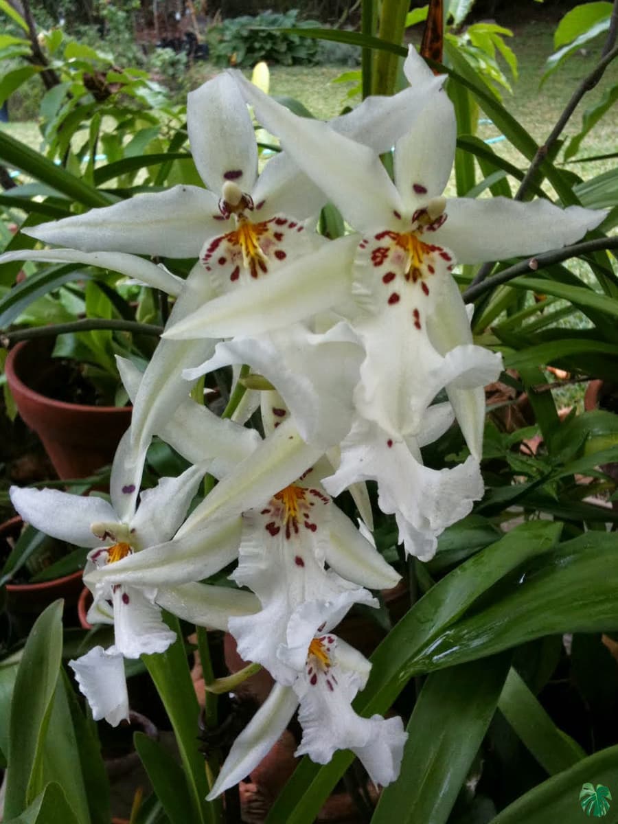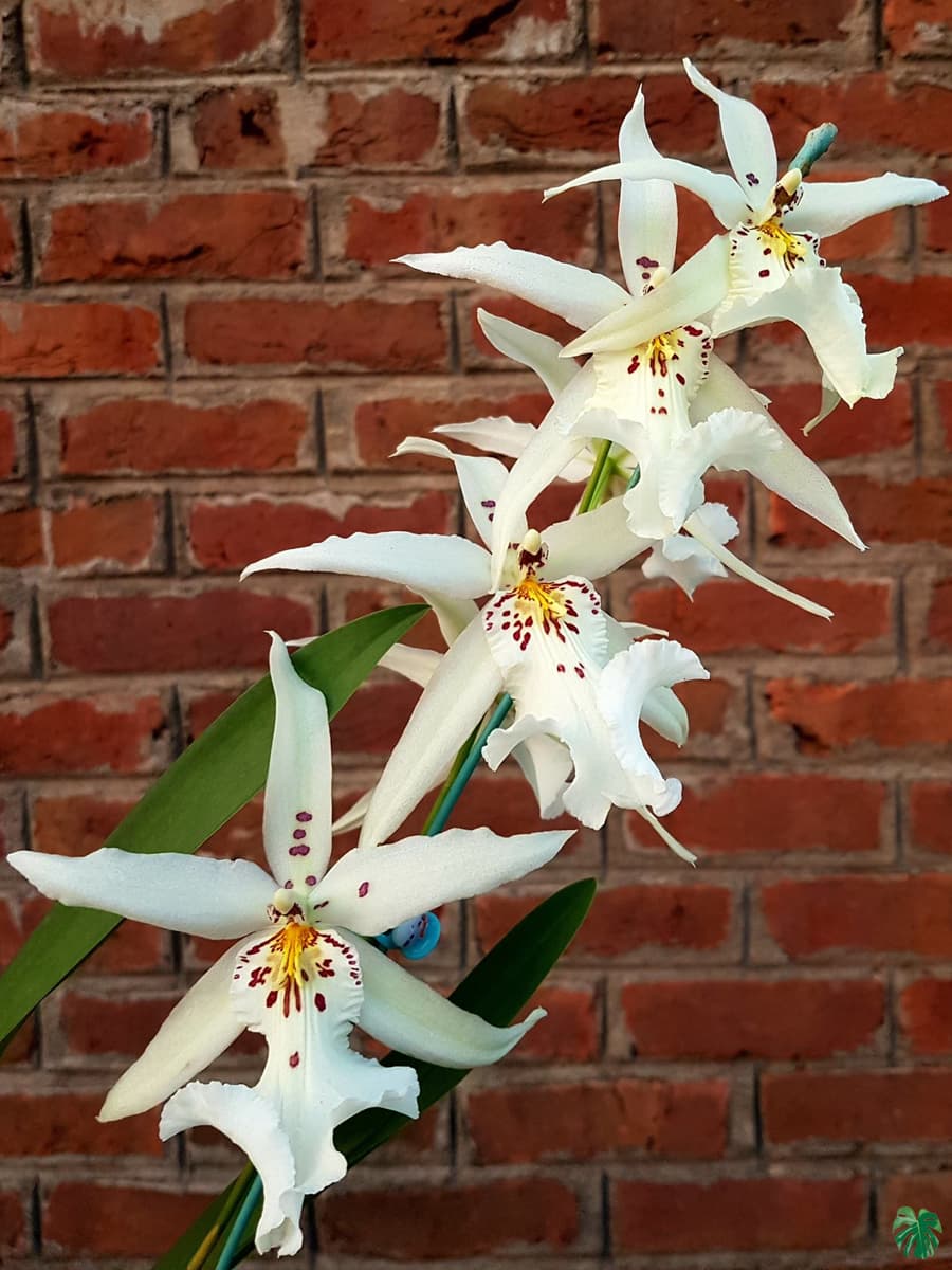 Aliceara Dgmra. Winter Wonderland ‘White Fairy’, also known as Degarmoara and registered in 1989 by Bee Lian Nursery, is an intergeneric epiphytic orchid hybrid from Miltassia Cartagena and Odontoglossum Gledhow. This intermediate to advanced level plant can grow into a large specimen, blooming with spectacular star-shaped white flowers featuring dark maroon spots, a subtle yellow tinge, and a prominent pearl-like white lip that emits a delightful fragrance.