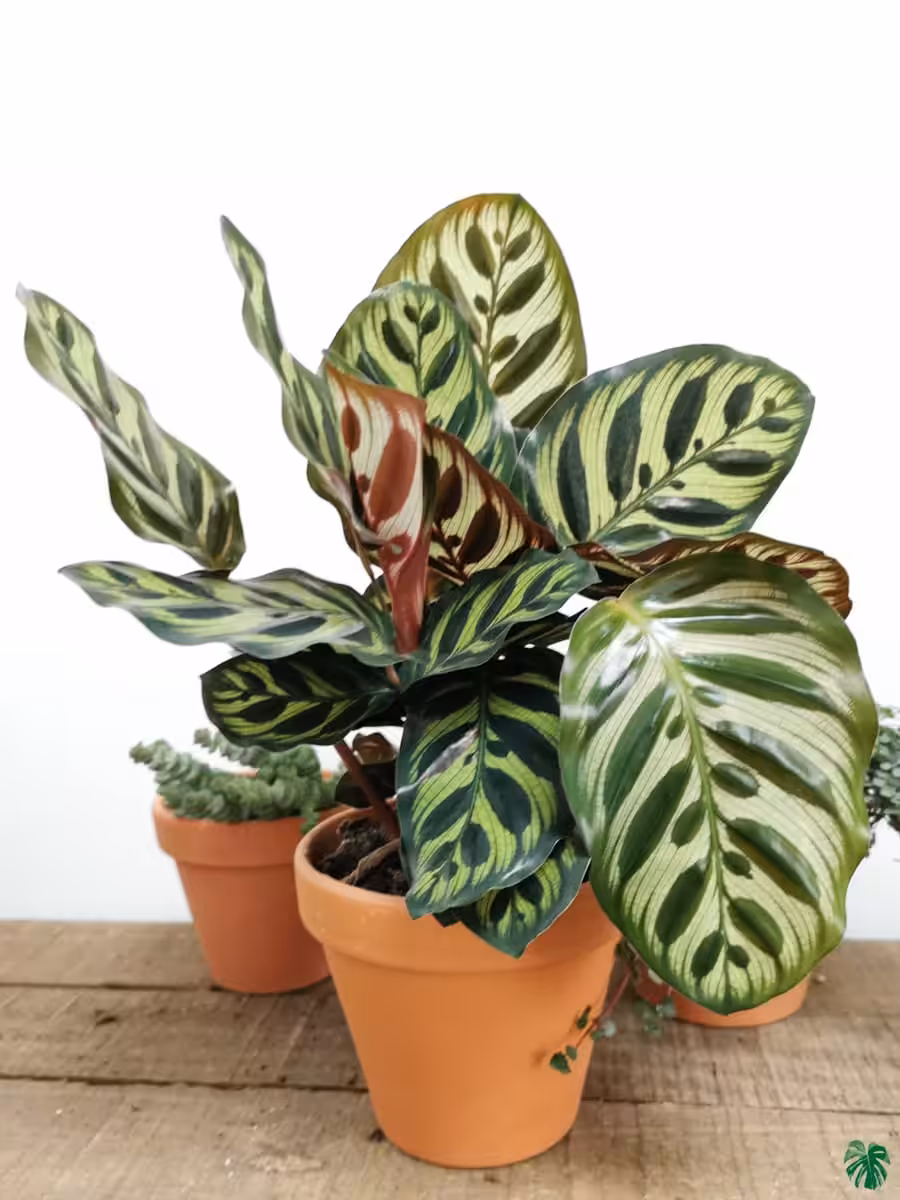 Calathea Makoyana likes diffused, indirect light, in a humid environment so kitchens and bathrooms are ideal along with regular misting and your plant will thrive. Wipe Calathea’s leaves with a damp cloth to remove dust, so that it can breathe properly. This plant is safe around children and pets.