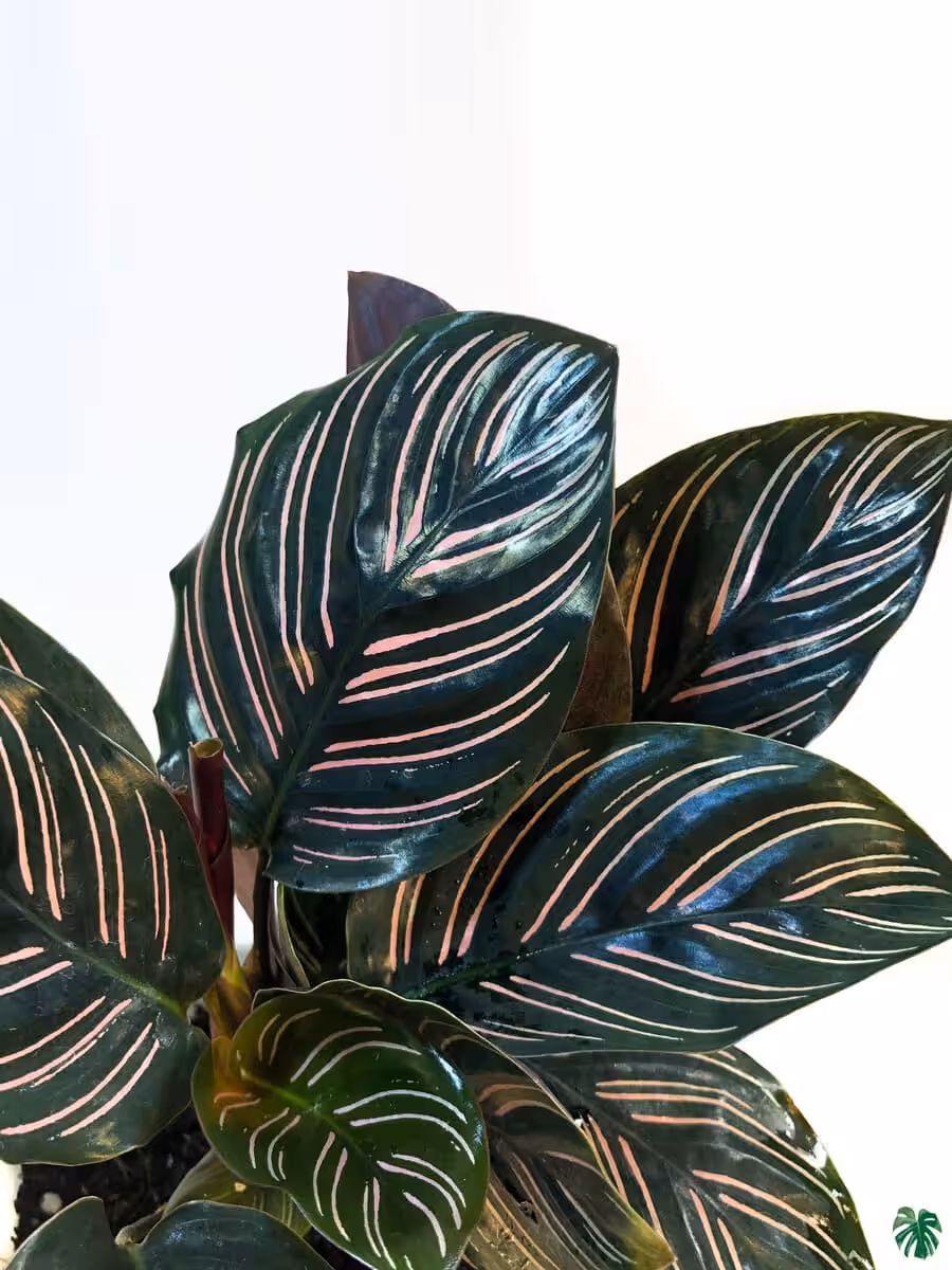 Pinstripe Calathea has beautiful, glossy leaves with fish-bone-like stripes and is considered one of the easier prayer plants to care for.