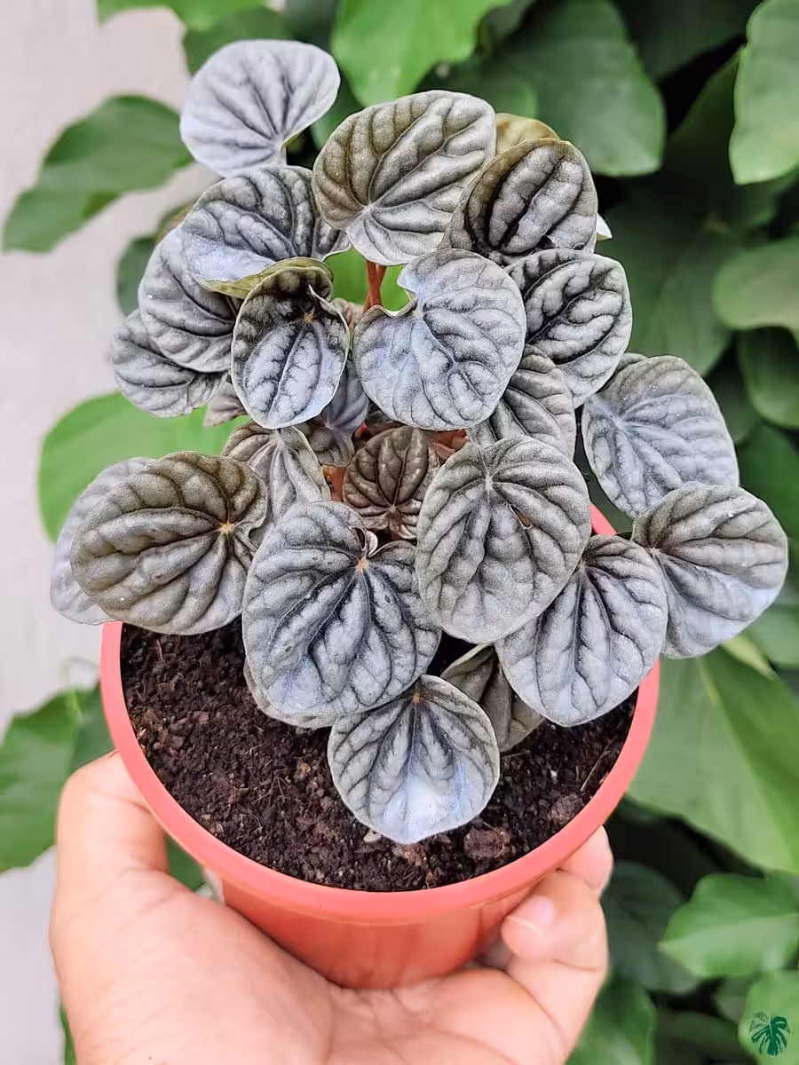 Gorgeous texture and iridescent silver foliage make this Peperomia Silver Ripple Black a highly sought-after and hard-to-find houseplant.