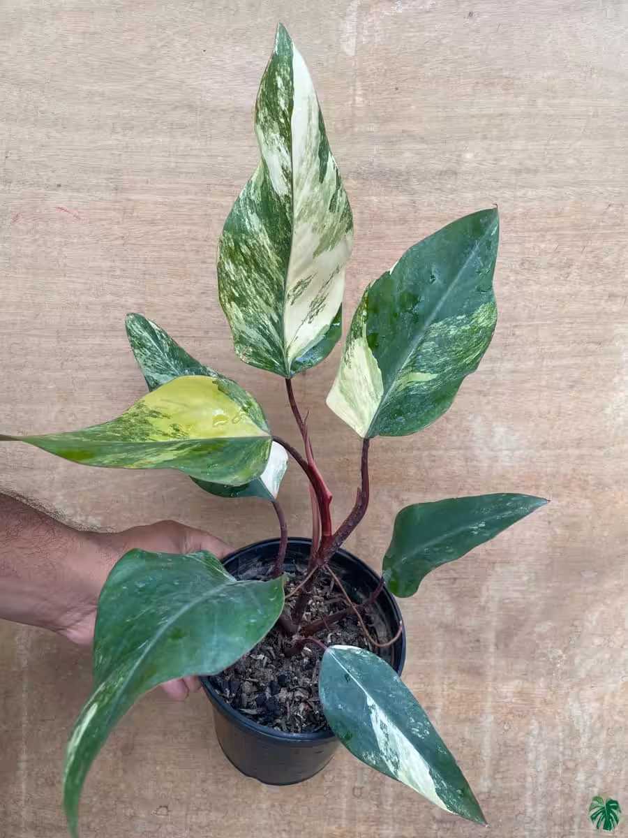 Philodendron Strawberry Shake is a gorgeous plant with variegation of multiple colours. Add in the red stems, and you’ve got a breathtaking decorative plant!