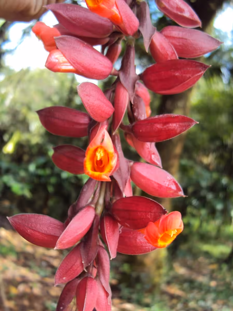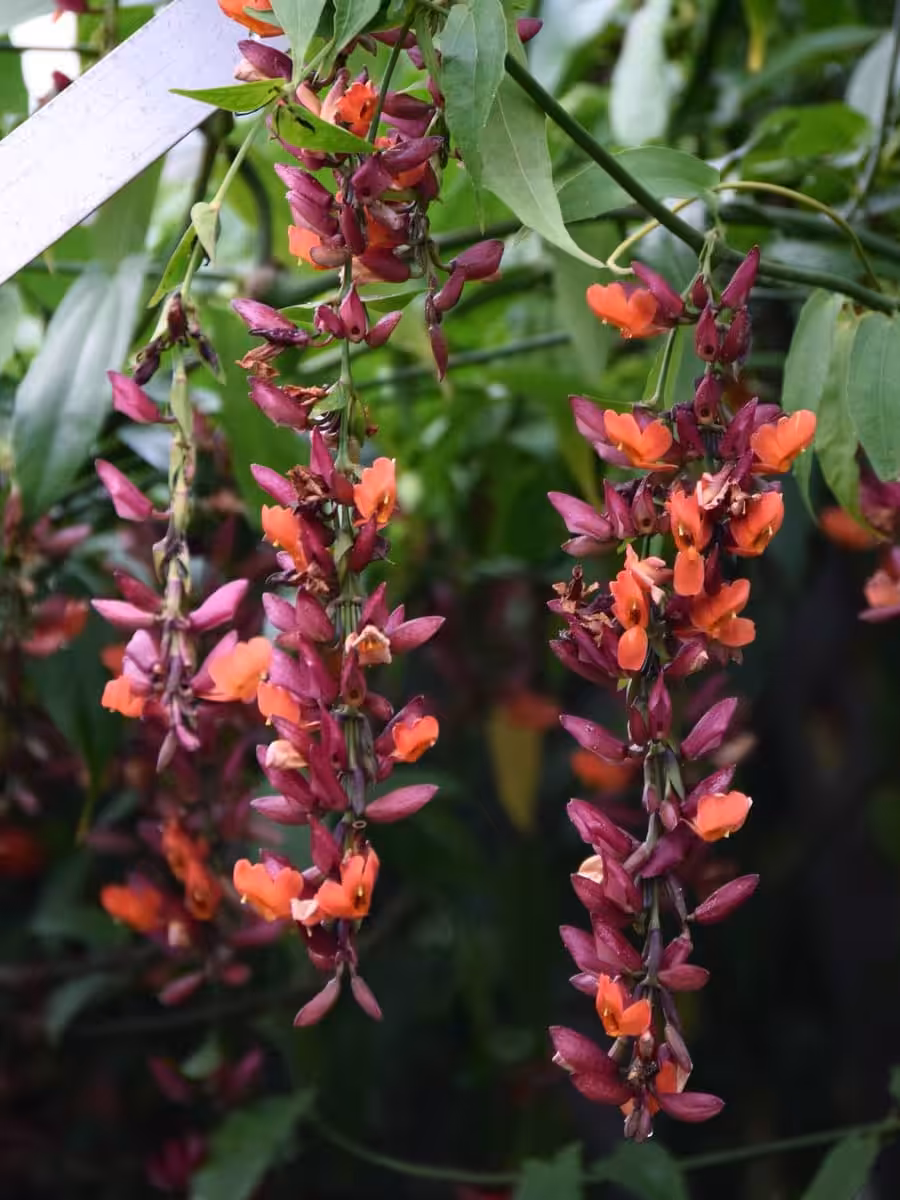 Thunbergia Coccinea is a gorgeous flowering plant. The bright red flowers of unusual shape are hanging from the vine in clusters, and look stunning. The intensity of the colour seems to depend upon the temperature in which it is blooming. It appears that the orange coloring is more likely in warmer temperatures, and some fading from full sun, while the more intense redish coloring when blooming in cooler conditions.