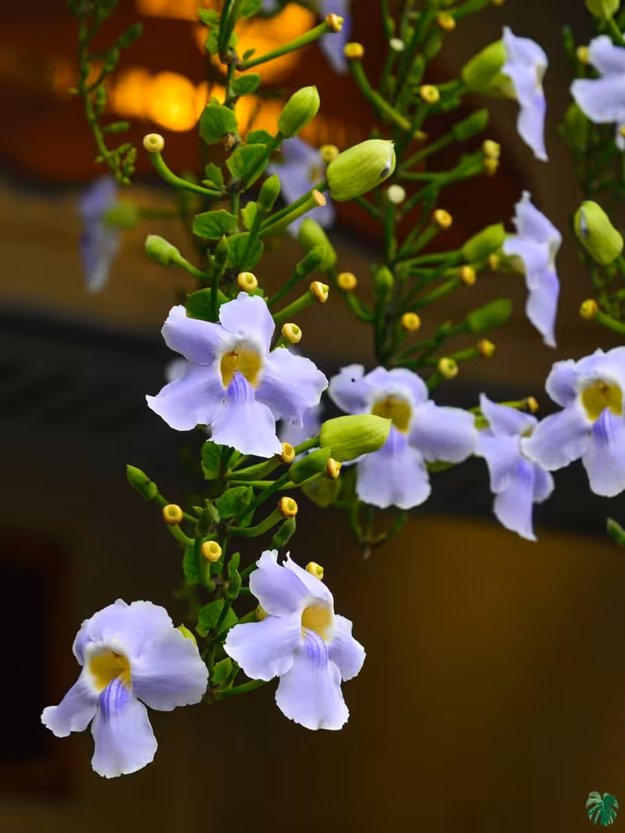 Thunbergia Grandiflora is a gorgeous flowering plant. The light blue or violet flowers are hanging from the vine in clusters, and look stunning. The intensity of the colour seems to depend upon the temperature in which it is blooming. It appears that blue coloring is more likely in warmer temperatures, and some fading from full sun, while the more intense blue coloring when blooming in cooler conditions.