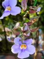 Thunbergia Grandiflora, popularly known as the Bengal Clockvine, is a tropical vine with unusual light blue to violate hanging flowers. Best planted over an arbor where the flowers can hang down, It’s a very desirable plant.