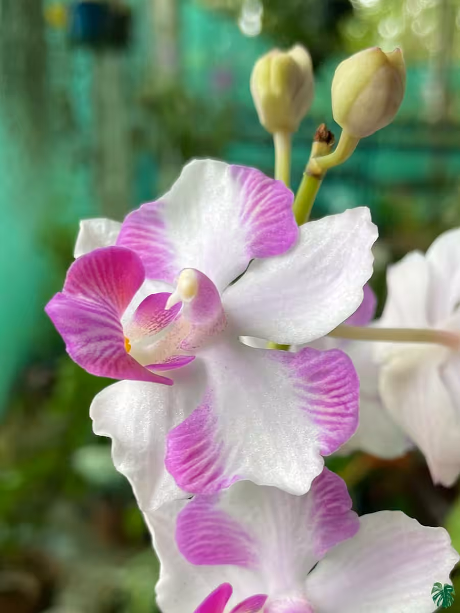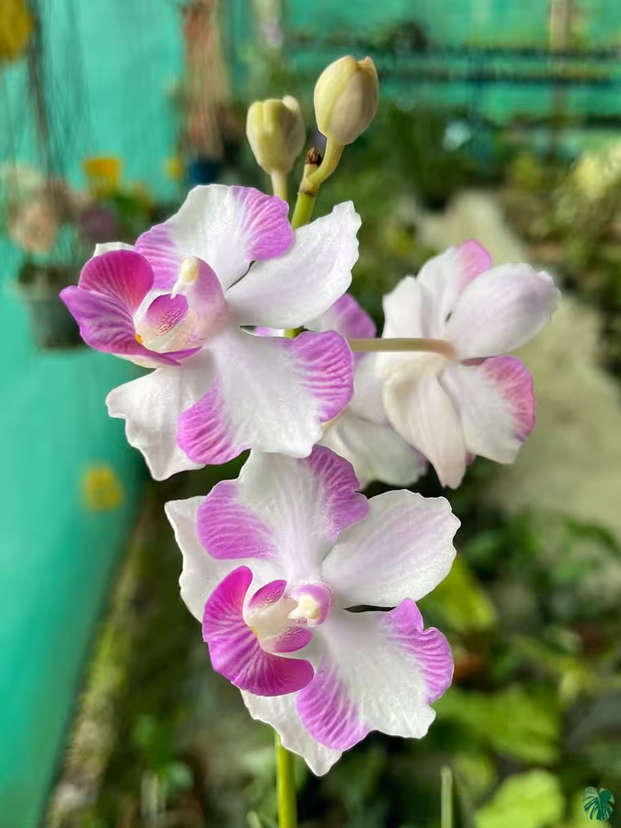 You can grow Vanda Denisoniana Coelestis Alba bare root in baskets if you have good heat and humidity. However, it also does just fine in plastic pots with good drainage in an orchid mix. It loves warm temperatures. If you like to keep your house warm, you’ll make an excellent orchid owner.