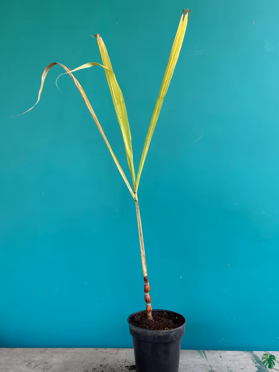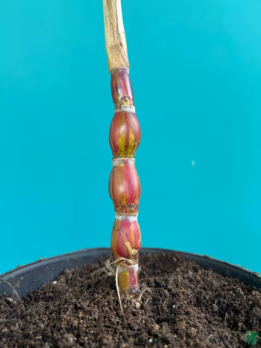 Grow the stunning Variegated Sugarcane, a rare mutation of the common sugarcane that looks as sweet as it tastes. Unlike standard green cane, this variety features beautiful vertical stripes of lime green, creamy white, and soft pink on the stalks, resembling bamboo. The leaves are also variegated, making it a spectacular ornamental piece for your garden. You will receive a healthy, rooted sapling that is fast-growing and creates a lush, tropical screen. Once mature, the stalks are rich in sugar and perfect for chewing or fresh juice.